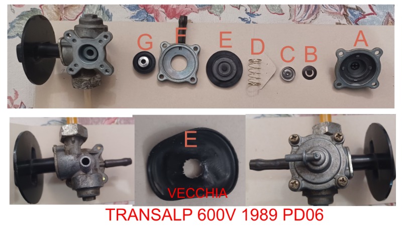 Di solito quello che trovo su questo forum è molto esaustivo e completo ma questa volta sono in difficoltà, ho avuto problemi con il rubinetto che non erogava sufficiente benzina ai medi regimi infatti l'ho smontato e ho trovato la membrana bucata come da foto e li mi sono fermato e ho ordinato il kit di riparazione, ora vado a rimontarlo e mi accorgo che la parte in foto A sotto a quella rondella in metallo C c'è una ulteriore guarnizione B che tra l'altro era incollata (appiccicata) naturalmente nel kit non c'era e non ho trovato in rete ma neanche sul manuale d'officina questa configurazione di pezzi, Io ho fatto circa 50.000 Km in quella configurazione ed è sempre andata bene, è normale il rubinetto o no?